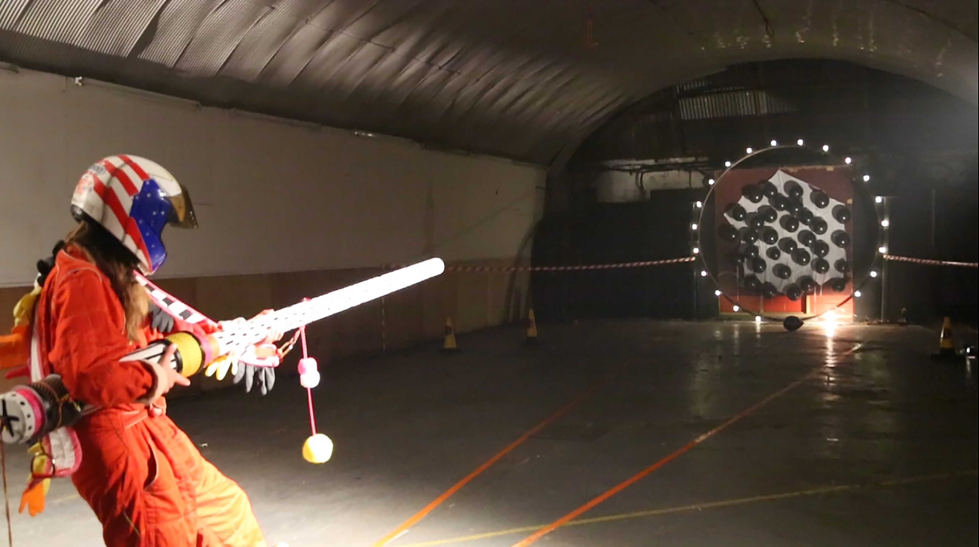 On the closing night of the exhibition the artists took their work to the streets and together with a huge crowd of guests waving banners and making noise, paraded to a secret destination where Cristina Lina performed her Niki de Saint Phalle inspired potato cannon firing. Rebecca Jackson had constructed a target from her wearable tablecloth and filled black balloons with powder paint and as each potato hit the cloth balloons were exploded and paint flew. Drums rolled, the crowd roared, a potato goddess in a cloak of rubber gloves emerged from the debris and an all girl crew of DJs took over – Smouldering Ashtray, Jockey Leg, PG Tips, Trixy Skulz and Deejay D’Afro– to make it a night to remember.