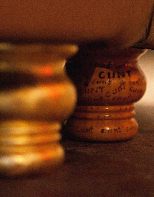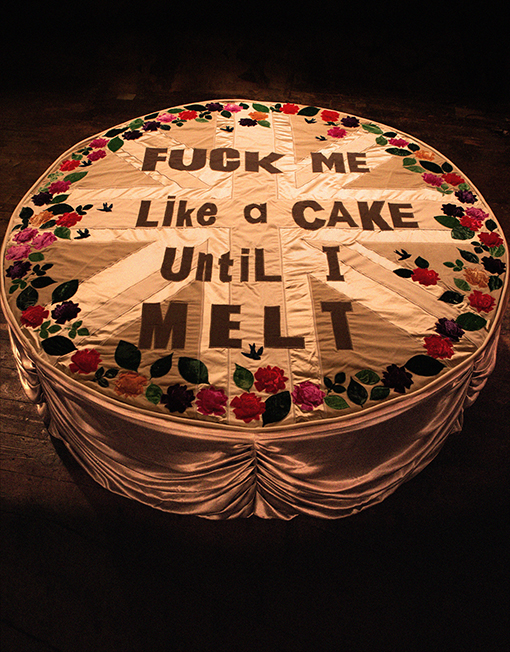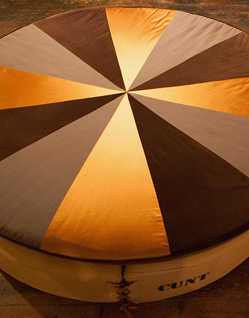 Circular celebration cake bed in three layers – army tent canvas, silk, velvet and satin, pressed velvet flowers and leaves, graffitied and gilded legs